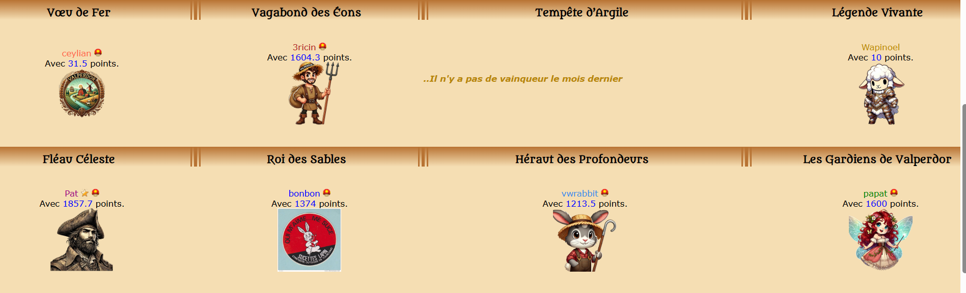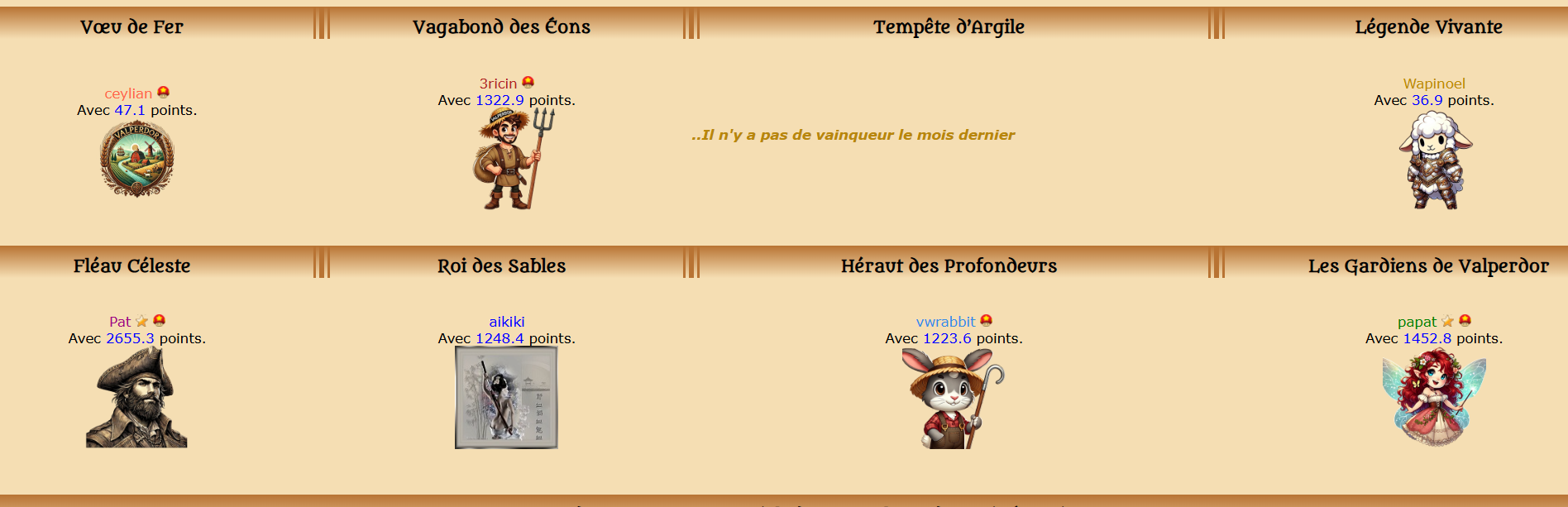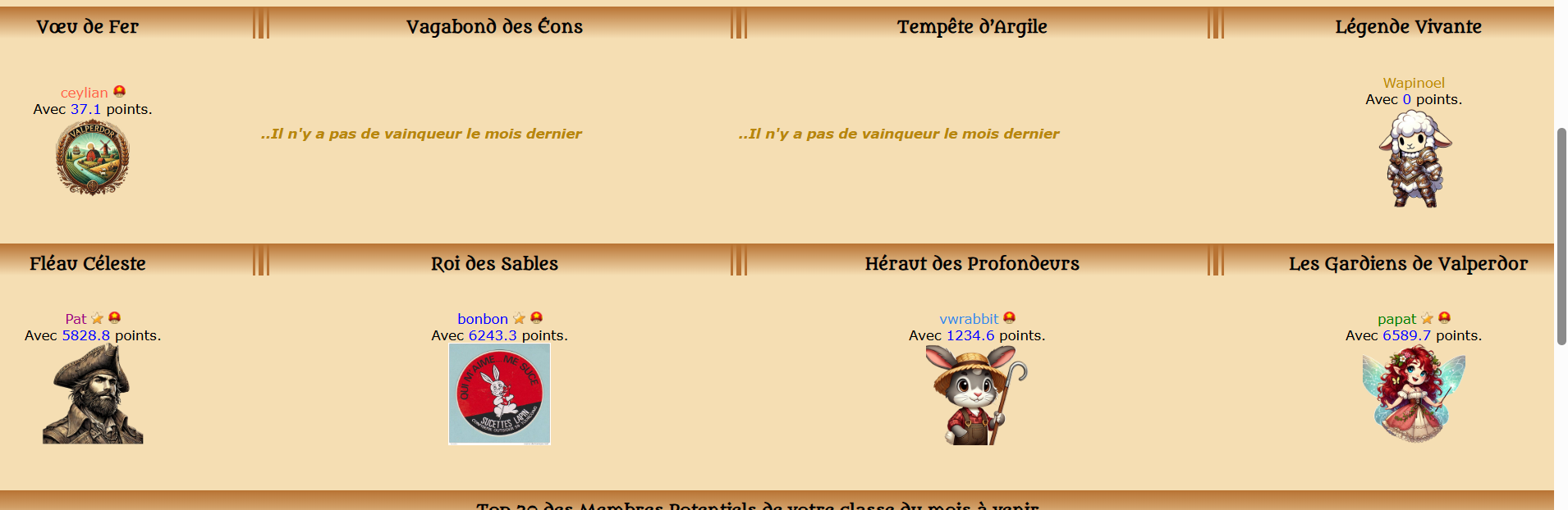 Joueur Inscrit Pays: | Ô valeureux habitants de Valperdor, Le titre de Élus de la Communauté Valperdor est attribué aux joueurs les plus actifs et les plus engagés dans différentes catégories du jeu. C'est notre manière de les remercier pour leur contribution à la communauté de Valperdor. Où peut-on gagner des points pour devenir Membre du Mois ? Les points peuvent être accumulés un peu partout sur le site. Se seront les bonnes actions dans le jeu qui compteront . Par exemple : Le nombre de fois où vous avez aidé d'autres joueurs Le nombre de dons faits dans votre confrérie Ou encore les fois où vous avez aidé à charger un bateau Bref, c'est l’esprit de solidarité et d’entraide de Valperdor qui est mis à l’honneur ! Et ça rapporte quoi ? Bonne question ! Je vous laisse découvrir la récompense qui vous attend lorsque vous serez élu Membre du Mois : un titre prestigieux dans le jeu et peut-être bien plus encore ! | |
