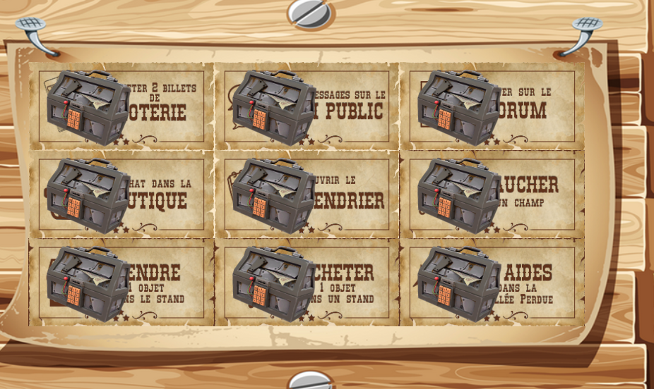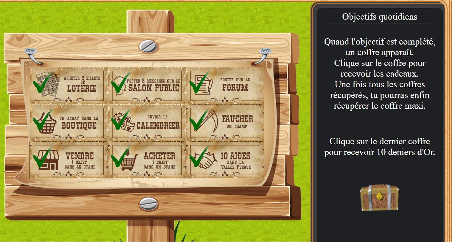 Joueur Inscrit Pays: | Oyé les copains Pour que vous veniez tous les jours , le wapin a été malin est à créer le système d'objectifs quotidiens ! Et ces objectifs quotidiens remplis vous rapportent 1.000 deniers , 10 Deniers d'Or et 5 rubis. Et c'est grâce à ses jolis rubis tout rouge que l'on peut creuser notre magnifique carte aux trèsors disponible dans les confréries ! Oui mais où se trouvent la liste des objectifs quotidiens ? et bien ici : ![]() En cliquant sur le bouton violet vous decouvrirez une nouvelle page et c'est là que se trouvent ces fameux objectifs ! Vous devrez faire chaque chose demandé pour qu'un coffre apparaisse : - acheter 2 billets de loterie - poster 2 messages sur la shout public - poster 1 message sur le forum - faire un achat dans la boutique - faire un achat sur un stand d'un membre - vendre 1 objet dans votre stand - ouvrir le calendrier - faire 10 aides dans la vallée - faucher un champ ( ce bouton ne s'activera qu'au niveau 2 de ta grange , donc il est "gratos" pour vous qui n' étes pas encore à ce niveau ) Une fois ces objectifs fait ( 10 minutes max pour les faire " title=" " /> ) vous voyez ceci :![]() ho que c'est beau tout ces coffres !! Cliquez sur chaque coffre et là , magie !!Un nouveau coffre apparait sur votre droite : ![]() et voila , il ne vous reste plus qu'à cliquer dessus et vous recevrez vos 1.000 deniers , 10 Deniers d'Or et 5 rubis. | |