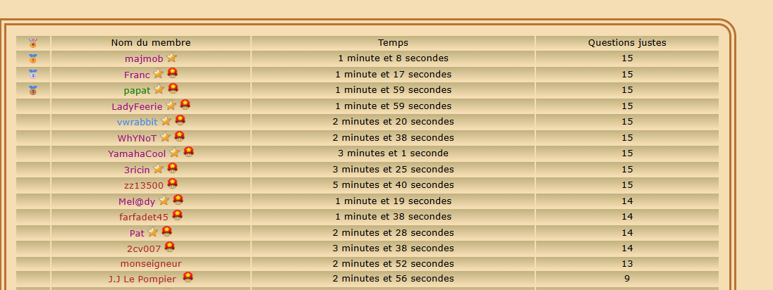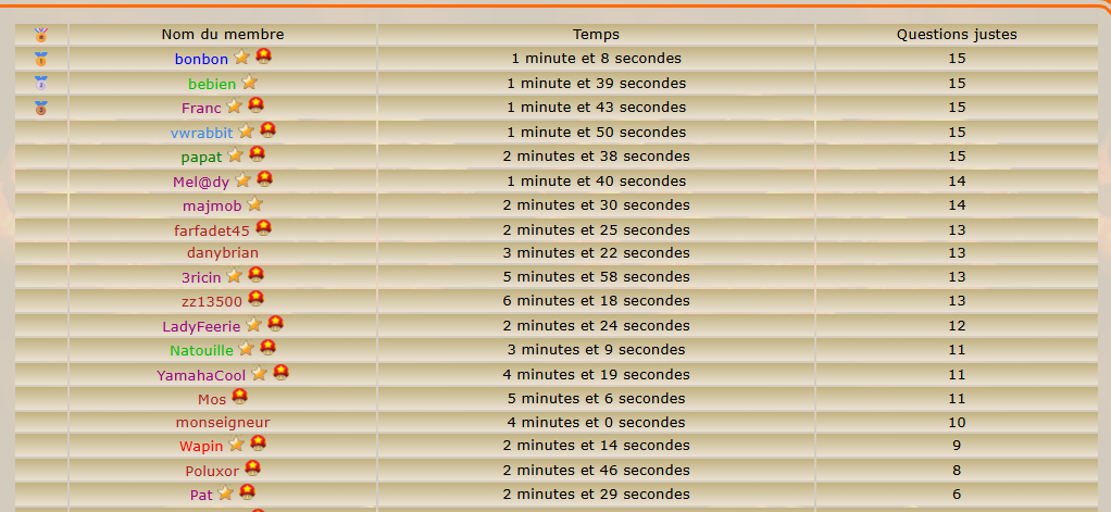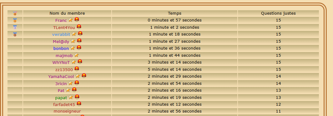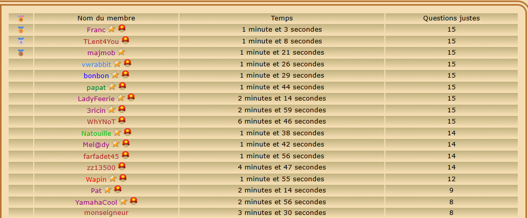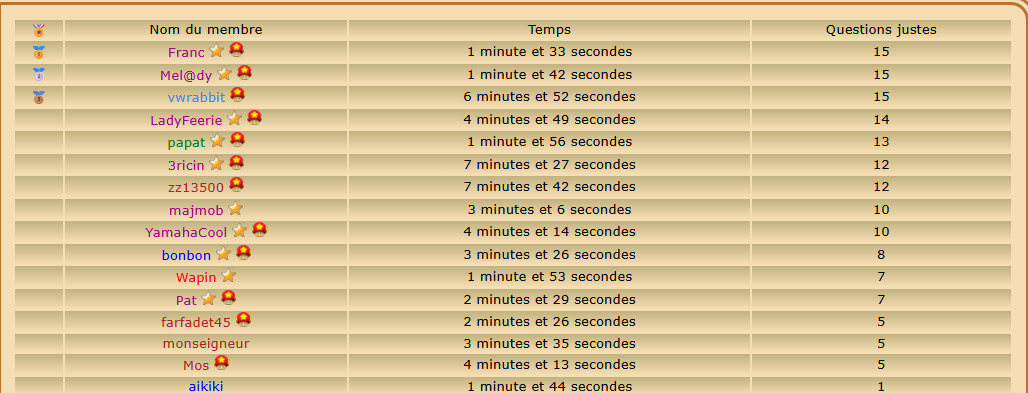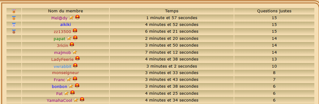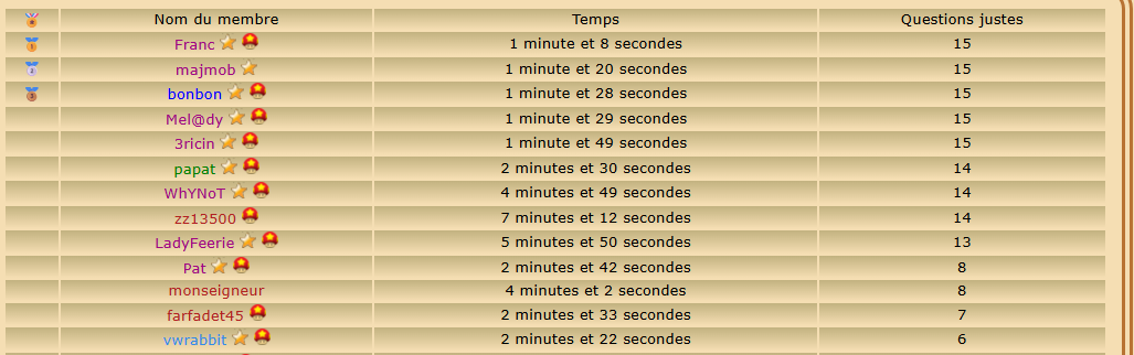 Joueur Inscrit Pays: | Classement du quizz : ![]() Top 5 : Franc Tlent4you majmob vwrabbit bonbon Bravo à vous et bravo à tous !!!!!! | |